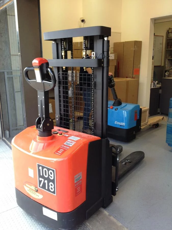 - מלגזון חשמלי הכולל מנוע שינוע ומערכת הרמה הידראולית חשמלית.